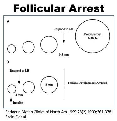 High insulin levels are predominantly responsible for the follicular arrest by disturbing the delicate balance of FSH to LH ratio that triggers the correct follicular development. During normal development, a surge of LH selects the dominant follicle which leads to proper ovulation. The high insulin levels make the follicle too sensitive to LH so they respond too early in the menstrual cycle, when they are not yet ready for ovulation.