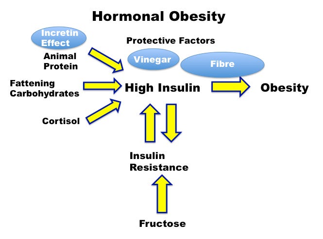 Insulin is one of the main drivers of obesity, leading to the Carbohydrate Insulin Hypothesis (CIH). This holds that dietary carbohydrates are the main or only cause of increased insulin, and thus reducing carbohydrate intake is necessary to lose weight. However, the CIH is incomplete, because there are many, many different influences upon insulin levels other than carbohydrates, including meal timing (eating late at night releases more insulin, incretins, vinegar, fibre all reduce insulin, insulin resistance and fructose directly increase insulin etc). This leads to a far more complete theory of obesity that takes all these factors into account instead of merely the carbohydrate or calorie content of foods.
