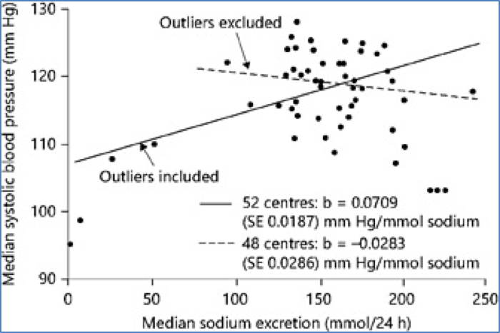 In this case, more information can be gained by removing these outliers from the study populations and seeing if the original salt hypothesis holds true. When those four primitive populations were removed and forty-eight Westernized populations were left in the study, the results were completely opposite the original findings. Blood pressure actually decreased as salt intake increased. Eating less salt was not healthy, it was harmful.