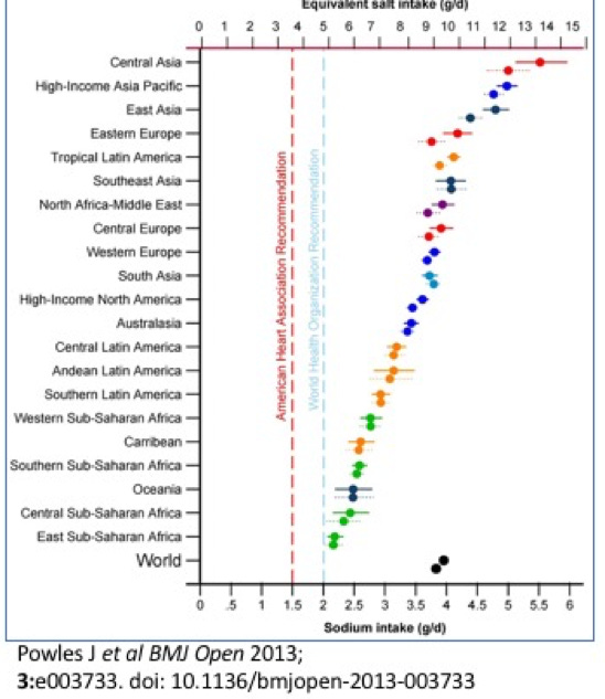 The most recent survey of global salt intake shows that no area of the world conformed to either the AHA or the WHO recommendations for salt restriction. The central Asian region had the highest salt intake, followed closely by high income Asia Pacific region including Japan and Singapore. The Japanese diet is notoriously high in sodium with copious use of soy sauce, miso and pickled vegetables. The Japanese themselves seem to suffer no ill effect as they have the world’s longest life expectancy at 83.7 years. Singapore is third in life expectancy at 83.1 years. If eating salt was really so bad for health, how could the world’s longest lived people also eat one of the world’s saltiest diets?
